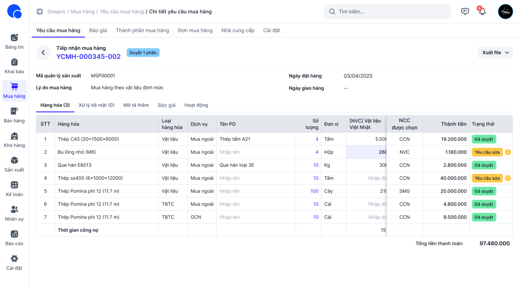3. Phê duyệt YCMH: Đây là “chốt chặn” quan trọng. Người quản lý sẽ duyệt yêu cầu dựa trên hai tham số: Nhu cầu thực tế (từ sản xuất) và Đơn giá dự kiến (từ báo giá). Điều này loại bỏ tình trạng mua sai chủng loại hoặc mua với giá bất hợp lý.
